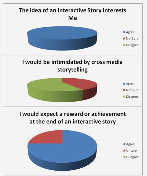 Below are the compiled results of the first phase of feedback i will be generating on my project. Although a small number of people were asked it was to get a general understanding of how people feel about interactive stories. All the people were between the ages of 18 and 22.