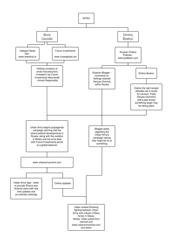 I have completed the first draft of my literature and have been concentrating on plotting out the proof of concept. This is the first draft of the flowchart which represents the branches of the story and how they relate to each other.